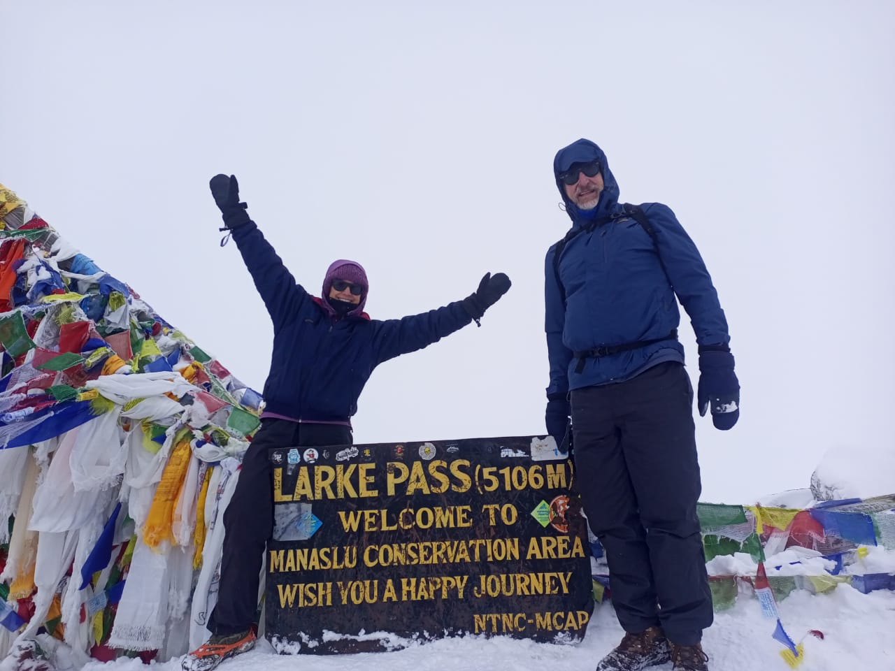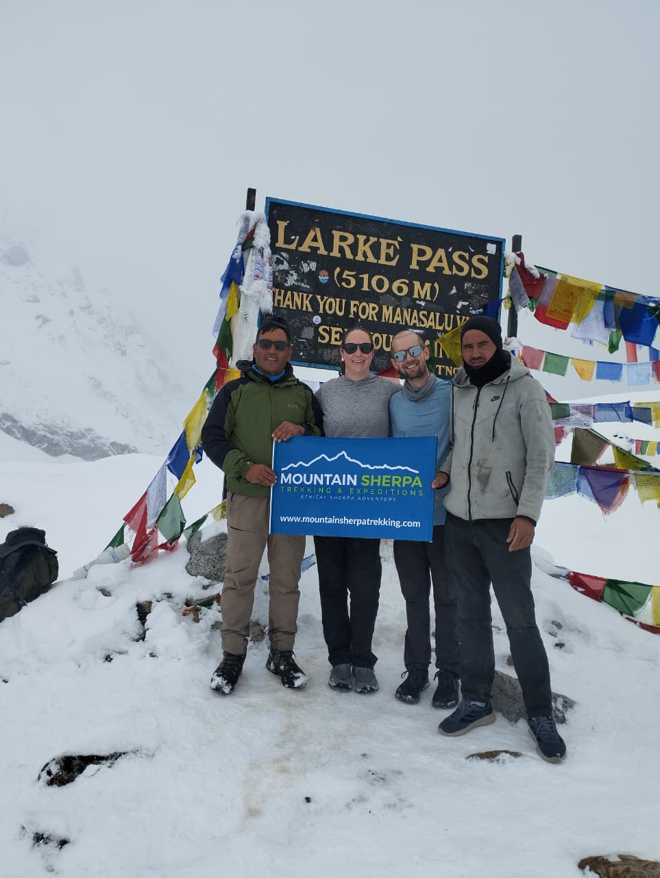 Embarking on the most challenging leg of our trek, we confront the formidable Larkya La Pass, standing tall at 5,160 meters (16,924 feet), where panoramic views of surrounding peaks await. Guided by our seasoned Sherpa expert with over 27+ years of experience, we traverse this high-altitude terrain with a 99% success rate, a testament to the expertise and dedication of our Sherpa guides, renowned worldwide for their honesty and unparalleled guiding services.